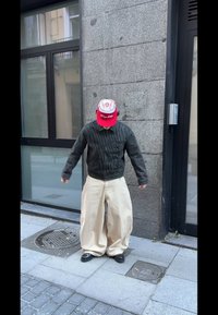 • Fekete vékony csíkos zakót és széles bézs nadrágot viselő személy, aki egy piros-fehér baseball stílusú sapkát tart egy városi járdán.