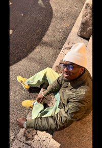 • Zöld és sárga tűzésmintás nadrág, olívazöld bomber dzseki, fehér póló, sárga sportcipő sötét részletekkel, egy faajtó mellett állva.