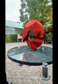 • Csíkos kapucnis dzseki tompa zöld és bézs színben, széles fekete nadrág, fekete cipő, áll egy nagy vörös fém szobor közelében.