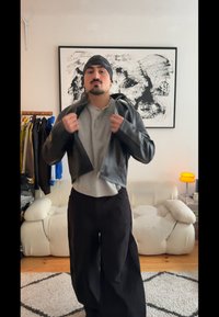 • Fekete, széles szárú nadrág texturált anyagból, szürke cipzáros pulóverrel és fekete bőrdzsekivel párosítva, kezében átlátszó italos palack.