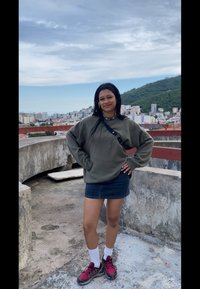 • Zöld, oversized pulóver, farmerruha, laza testtartás, fonott haj, tetőn állva városi és hegyi háttér előtt borongós ég alatt.