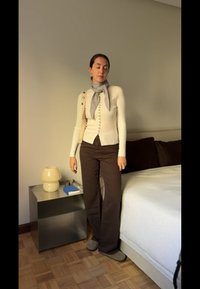 • Tejelt minta hosszú ujjú krémszínű felső ezüst gombokkal, szürke sállal párosítva, és egy bézs táskával, amelyen nagy kör alakú díszek találhatók. Barna nadrág.
