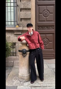 • Burgundi színű, cropped dzseki elülső zsebekkel, fekete, gombos, széles lábú nadrág és fekete sapka, egy kőoszlop mellett, amelyen oroszlán díszítések találhatók.