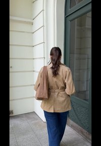 • Farmerdzseki trench kabát széles ujjakkal, dupla gombos záródással és laza fazonnal. Széles szárú farmernadrággal és fonott barna táskával párosítva.