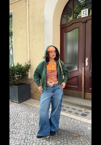 • Zöld cipzáros kapucnis felső, narancssárga sapka logóval, virágmintás ujjatlan póló fölött. Lazább szabású farmernadrág, bonyolult mintázattal.