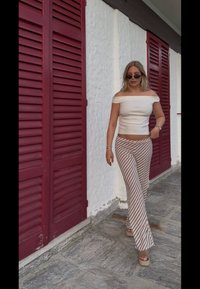 • Váll alatti krémszínű blúz széles lábú csíkos nadrággal, fehér és burgundi színekben. Kerek napszemüveggel és texturált háttérrel.