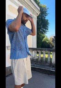 Férfi kék csipkés ingben, fehér pólóban, foltos farmer rövidnadrágban, kék sportcipőben és világoskék sapkában áll a teraszon egy bézs épület mellett.