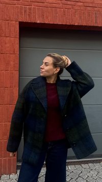 • Túlméretezett gyapjúkeverék kabát sötétkék és zöld kockás mintával, széles gallérral, nagy gombokkal és texturált felülettel. Bordó pulóver fölött viselve.