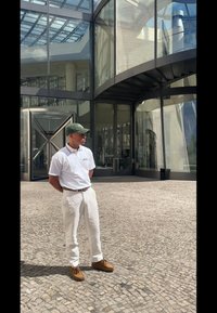 • Fehér póló, világos bézs nadrág, barna cipő, zöld sapka. Kövezett úton áll, a háttérben modern üvegépület.