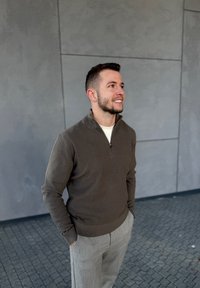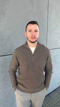 Fiatal férfi mosolyogva, csempézett talajon sétál, barna dzsekit, bézs pulóvert, fekete nadrágot és fekete cipőt visel szürke fal előtt.