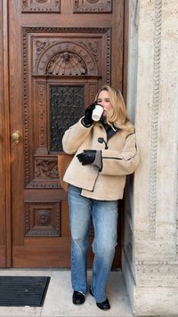 • Bézs színű báránybőr kabát fekete szegéllyel és kapoccsal, szürke garbó fölött viselve; kávéscsészét tart, fekete kesztyűt visel.