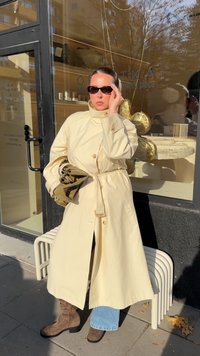 • Krém színű ballonkabát gombos részletekkel és övvel, kék bőszárú farmerrel és barna, lazán álló csizmával párosítva. Zöld táska és napszemüveg.