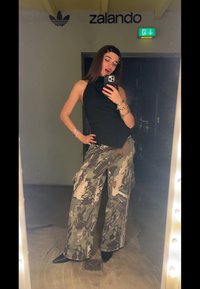• Fekete hát nélküli felső, zöld és bézs árnyalatú mintás cargo nadrág. Kiegészítők között hajcsatok és egy karkötő találhatók. Zöld csempézett háttér.
