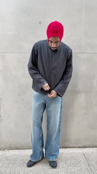 • Fekete dzseki, világoskék, bőszárú farmernadrág és élénkpiros kötött balaklava. A háttér sima, szürke betonfal.