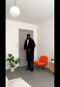 • Fekete kétsoros kabát bézs pulóver felett, laza sötét farmernadrággal párosítva. Kiegészítők: fekete sapka és napszemüveg. Narancssárga szék a háttérben.