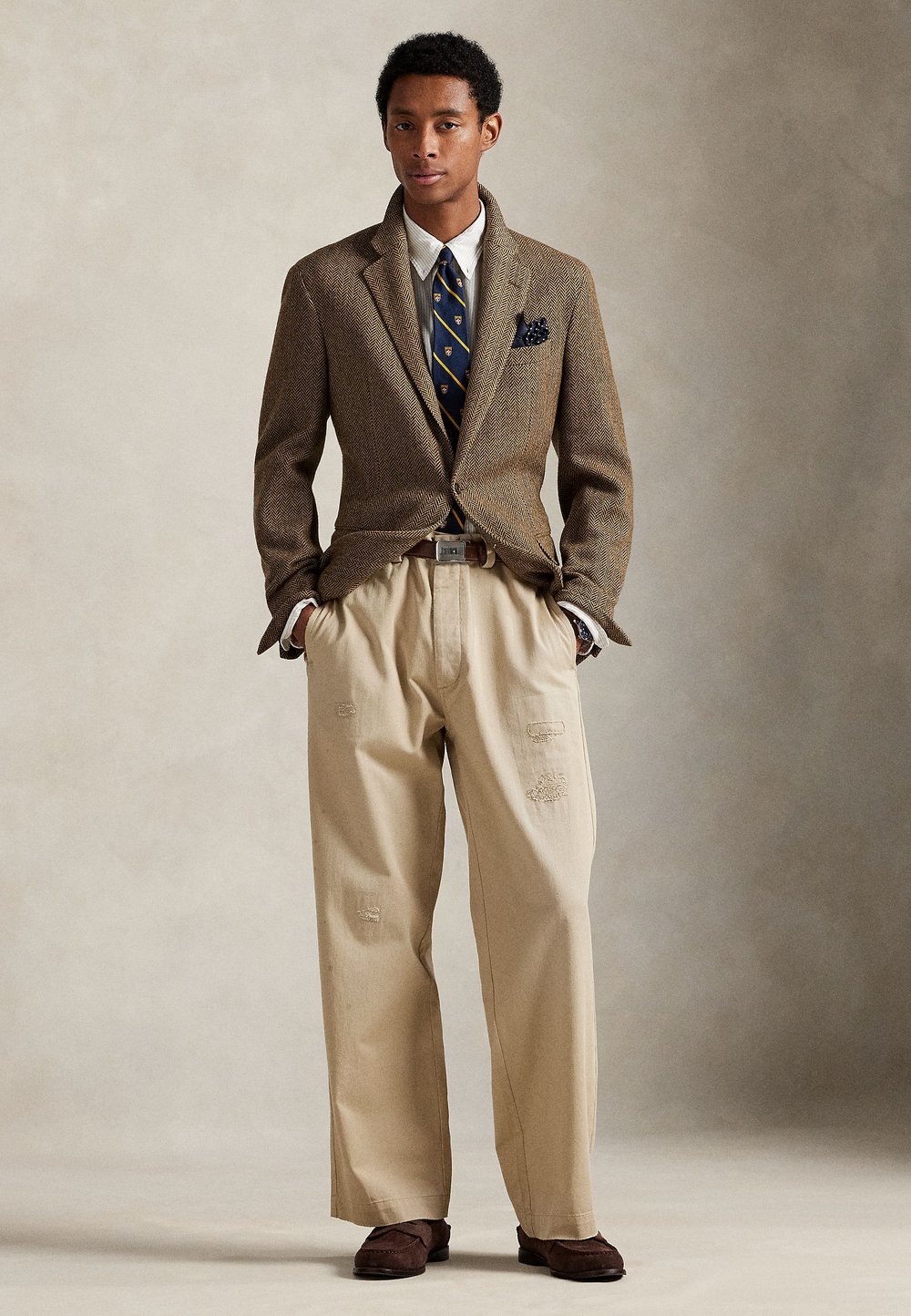 Férfi fekete kabátot visel egy barna blézer felett, szürke inggel és csíkos nadrággal. Fehér sportcipő; belső tér szürke kanapéval és függőlámpákkal.