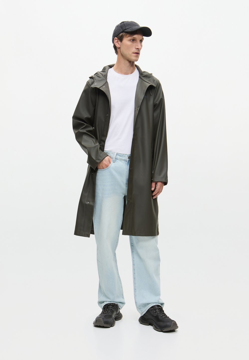 Hosszú, sötétzöld esőkabát kapucnival, fekete nadrág és fekete cipő, egy fém szerkezet mellett áll, köves úton.