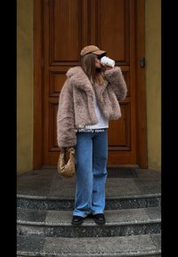 • Műszőrme kabát zabkása színben, laza fazonú kék farmernadrág, fekete mokaszin arany díszítéssel, barna sapka felirattal, kávésbögrét tartva, szövött táska.