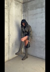 • Khaki bőr motoros dzseki ezüst cipzárakkal és övvel a deréknál, farmer rövidnadrággal és térd fölé érő szürke csizmával párosítva. Fekete kézitáska kiegészítés.