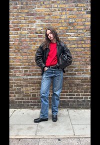 • Fekete bőrkabát, piros pulóver, kék farmer, fekete bokacsizma. Texturált téglafalnak támaszkodva, kezét a zsebében tartva, laza testtartásban áll.