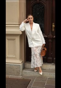 • Fehér, oversized blézer egy csipkés szoknya felett, barna bőr kézitáskával, amely arany hardverrel rendelkezik. A háttérben egy texturált fal és egy díszes ajtó látható.