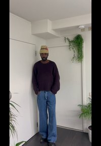 • Sötétlila bordázott pulóver, világoskék laza farmernadrág és fekete cipő. A modellt bézs sapka viseli. Belső tér növényekkel és egy fehér ajtóval.