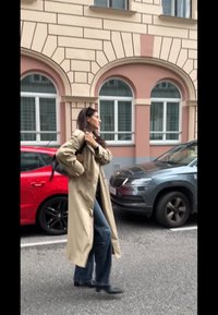 • Beige trench coat fekete pulóver felett, kék farmernadrággal és hegyes fekete bokacsizmával párosítva. Textúra: sima kabát, farmer anyag.