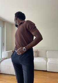 Világoszöld, hosszú ujjú polo póló, amelyet magas derekú, olíva zöld nadrággal és sötétbarna cipővel párosítottak, semleges háttér előtt.
