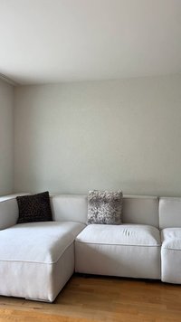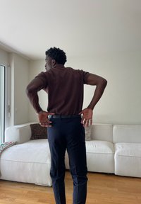 Férfi, fekete pulóverben és szürke nadrágban, fehér kanapé mellett áll, amely mintás párnákkal díszített, világos nappaliban.