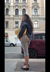 • Egy nő fekete, cropped kabátot és kockás capri nadrágot visel, egy sárga táskával a kezében áll egy szürke, díszes ajtó mellett, fekete kiegészítőkkel.