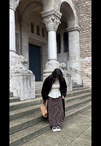 • Hosszú fekete műszőrme kabát bézs leopárdmintás szoknya felett, kis bézs kézitáskával és fehér felsővel, kőlépcsőkön állva.