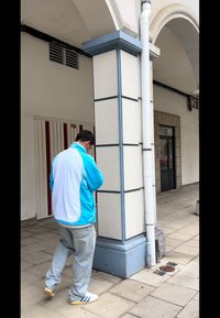 • Kék és fehér cipzáras sportdzseki csíkokkal, világoskék farmernadrág és fehér sportcipő. Egy oszlopnak támaszkodva, csempeborítású területen áll.