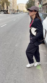 • Nő tengerészkék blézerben és nadrágban, piros ingben, szürke sapkában, napszemüvegben és fehér tornacipőben áll díszes fekete fémkapu előtt.