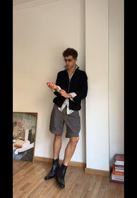 • Fekete cipzáros kardigán csíkos póló felett, szürke rövidnadrág és dizájnos aknacipő mellett, minimalista háttér előtt.