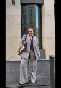 • Világosszürke öltöny széles lábú nadrággal és zakóval, fekete felsőre rétegezve. Bézs kézitáska díszítő charmokkal és fekete sportcipő.