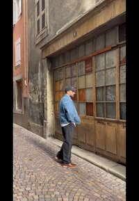 • Farmerdzseki két elülső zsebbel, kék ing, fekete nadrág és barna fűzős cipő. A háttérben fából készült ajtók és graffitik láthatók.