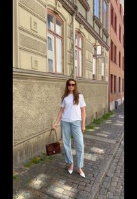 • Fehér, rövid ujjú póló, enyhe fényű, világoskék, bő szárú farmernadrággal párosítva. Barna válltáska és ezüst karkötő emeli ki a megjelenést.