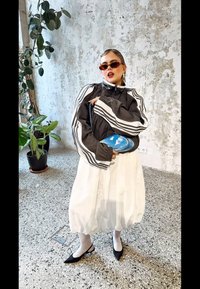 • Fekete cipzáras dzseki fehér csíkokkal, fehér szoknya és oversized kék táska. A modellen barna napszemüveg és rétegezett ékszerek vannak.