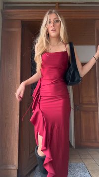 • Bordó testhez simuló ruha oldalt gyűrt részlettel, fekete díszítéssel párosítva. Hosszú, hullámos szőke haj. Minimalista kerek szemüveg.
