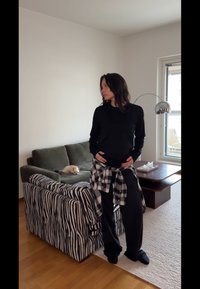 • Fekete, hosszú ujjú pulóver fekete nadrág fölött, derékon átkötött szürke és fekete kockás inggel, kezek a hason.