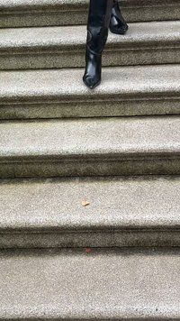 • Barna tónusú műszőrme kabát, testhezálló fekete ruha és tűsarkú, térdig érő fekete bőrbakancs; kőlépcsőn kapaszkodik, melynek fém korlátja van.