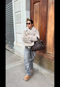 • Világosszürke műszőrméből készült kabát, vastag, puha textúrával. Széles gallérral és laza szabással rendelkezik. Barna bőrtáska díszítésekkel.