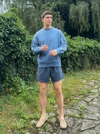 • Kék pulóver, kerek nyakkal és bordás mandzsettával, sötétkék rövidnadrággal párosítva. Bézs slip-on cipők, kövekből készült ösvényen állva, zöld növényzet körül.
