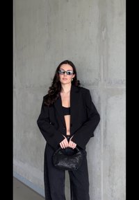 • Fekete, oversized blézer hosszú ujjal, fekete cropped top alá öltözve. A modell egy szőtt fekete kézitáskát tart. Texturált fekete nadrág díszítésekkel.