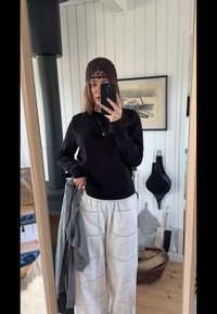• Fekete, hosszú ujjú felső, kerek nyakkivágással, fehér, texturált, bő szárú nadrág, amit kivágott minták díszítenek, egy barna kötött sapka és egy kávéscsésze.