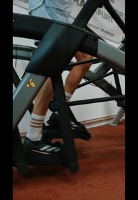 • Fekete elliptikus edzőgép függőleges kerettel, nagy lábtartókkal és monitorral. A mozgásban lévő felhasználó szürke sportöltözetben van. Edzőterem környezet látható.