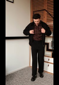 • Fiatal férfi, bajusszal és göndör hajjal, sötét kockás inget és fekete kabátot viselve, kabátját nyitva tartva áll bent, fa redőnyök közelében.