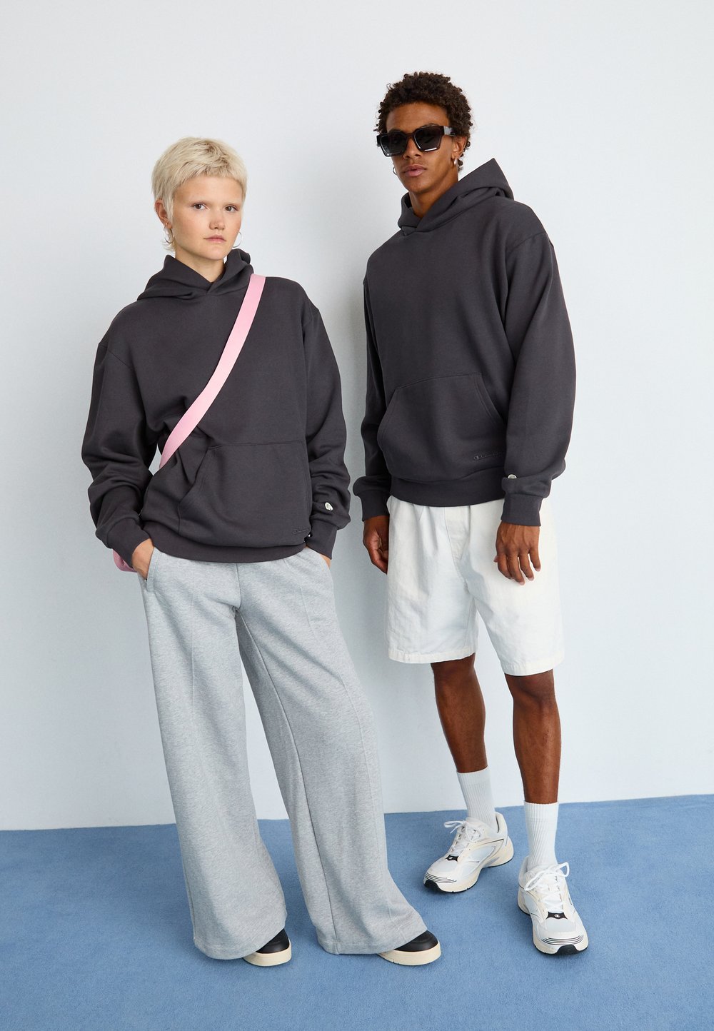 Beige kapucnis póló elülső zsebből és laza szabásból, fekete-fehér mintás, bő szabású nadrággal párosítva. Fekete, vastag talpú cipők.