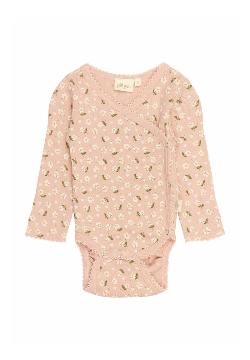 Hosszú ujjú baba body puha rózsaszínben, fehér virágmintával. Rugalmas kialakítású, fodros szélekkel és patentos záródással az alján.