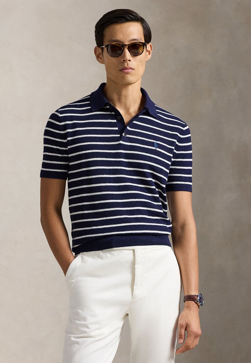 STRIPED COTTON-LINEN POLO-COLLAR SWEATER - Pólóing - bright navy combo